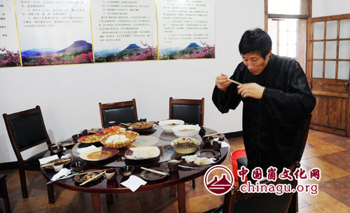 去年春夏之交,大会组委会把首届国际两仪拳比赛赛场设在了度假村的大礼堂。我以大赛组委会执行主席的身份,处理筹办、比赛等几乎所有事宜。比赛的前一天中午,带张吉龙、孙猛两个弟子到相距百公里的泰安参加中国武术世界运动协会中国两仪拳发展研究中心揭牌仪式,下午引领来自天南海北的运动员到蒙阴地下银河旅游,之后,安排运动员下榻旅游度假村。晚饭时,尽管大家纷纷招呼我们一起吃饭,可我们师徒三个得忙着照应大家,一直等到大家吃完离席,才抽了点小空,连坐都没来得及坐,囫囵吞枣地往肚里填了点大家吃剩的残羹冷炙。出乎意料的是,这副狼狈的吃相被中国崮文化研究会会长、中国崮文化网总编丁军国先生给抓拍了下来。