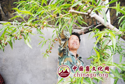 西崖村王端民正在自家的油桃大棚内忙着为过密的棚桃疏果。