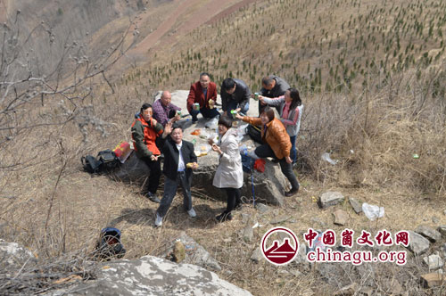 此次登山最热闹的要算会餐了。在山上找到一块平整的大石头当餐桌,大家把自带的饭菜汇集在一起,有炒猪肉,炒花生,炒荠菜,鸡蛋、苦菊、芝麻酱等,总共十多种。由于大家体力消耗大,饥饿感强,吃起饭来都感到特别香,饭量也比在家里大。