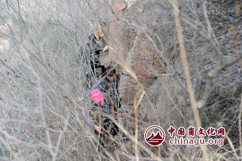 蒙阴北山黄崖顶,占据旧寨野店中,海拔六百二十六,三十六崮有其名。 羊年春天吹暖风,探索黄崖定征程,会长选择目标地,沂蒙公路向北行。 联社主任重友情,车载八人至北坪,村头老人亿抗日,十岁惨遭抓壮丁。 会长领路先头兵,不慎误入荆棘丛,剪开刺人圪针窝,攀爬手脚靠石缝。 忽见繁花呈粉红,既不是桃亦非杏,娇艳夺目忙拍照,哪管贴壁身悬空! 苍劲虬枝刚吐青,漫山成片是青松,随处可见护山棘,山巅谜团一大坑。 俯瞰周围纯山景,随波梯田一层层,坦埠旧寨和野店,三镇交界分水岭。 四周陡峭顶部平,岩壁以下坡缓冲,符合崮貌之特点,北与晨云是弟兄。 何时碾台说不清,生活遗迹是见证,残垣断壁到处是,坍塌围墙默无声。 旧时慌乱涂生灵,舍家崮上暂逃生,运水全靠葫芦头,不定哪时不保命。 如今社会得稳定,安居乐业脱贫穷,业余研究崮文化,增长见识趣味浓。