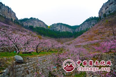 群崮巍峨披绿装桃园处处农家忙田园风光另陶醉城里来客任徜徉