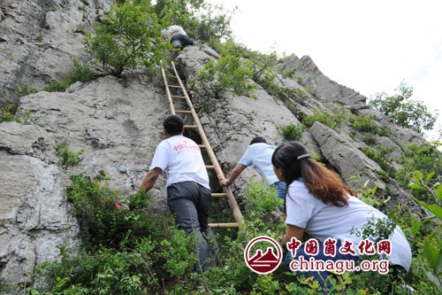 此时,沂源县的朋友还没来到。县电视台的记者正徒步在崮坡,还没能赶到崮下。我周围的几个人互相看了看,没有一人表示要先上。我说:李强,你们几个扶着梯子,我先上!不知道为什么,我今天的心情有点激动。难道我想当第一勇士?可是徐义厚师傅先上去了呀!我上去也是第二。但是话一出口,就不能再打退堂鼓。 我拽过绳子,怕第一次上没经验,又检查了一下保险绳上下垂的弧形的保险带,果然,保险带的扣松而不紧,我略作调整,然后系在腰间,把保险带扣扣好,然后双手扶着梯子,开始攀登。地势险要,绝壁悬崖,不可大意,倘有意外,生死难料。我深吸一口气,俯身往上攀,很快到了梯子的尽头。往上没有梯子的帮助了,要靠自己了。我观察了一下地形,直接往上攀?太危险!左侧?树枝和巨石拦路!往右侧看,似乎有一脚路可走。往上迈了一步,离开梯子,然后伸手去抓右前侧的岩石,希望借一把力,谁知却把手底的一块石头给拽出来了,我一慌,石头从手里掉下来,不好!倘若掉下去,必将砸到李强等人的头上,我急忙俯身前倾,右手前伸,抓住那块石头往前方一低洼处推去,石头安然落下,不再滚动。我吁了一口气,就这样停住了片刻。我发现自己正处在一个进退两难的境地。上?找不到踏脚的地方;下,离梯子有2米远了,也无法回。再说了,半途而废下去,我这张脸往哪里搁啊?还不被人笑掉大牙?!我感觉到下面的人正紧张地看着我,许是他们也看到了我窘态,为我捏了把汗。而正北方向,崮下的树林里钻出几个带着摄影机的男女,那肯定是沂源县赶来的朋友了。他们发现了我的危险处境,有女士就惊呼:哇!有人在攀崮?是谁啊?这也太危险了!男士们则举起相机,抓拍我进退两难的样子!