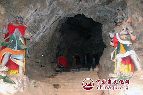 崮文化网 云霞洞位于沂蒙崮乡蒙阴县垛庄镇石屋山村后睡虎山,是一个天然溶洞,可容纳千人。因洞内供奉云霞娘娘,且该洞南有处露天天门,在洞内看天,云霞点点,而得名。传说云霞娘娘是泰山老母碧霞元君之妹,碧霞元君巡行天下,看中了这座山洞,便命云霞在此居留,建立泰山行宫。由于洞府宽广,位置优越,是修仙练丹之佳境,隋唐时代就被辟为道观,并在正对洞口的位置供奉道教的三清教主——元始天尊、灵宝天尊和道德天尊。一洞供奉四位尊贵的神,而且是男女神仙同处,这在各地都属罕见。