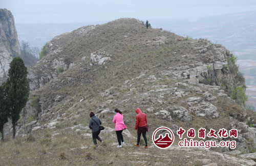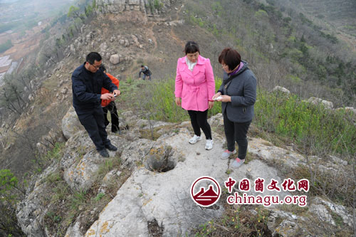 采风团一行从黄草崮西面登顶。对黄草崮、半边寨的地质地貌特征、植被种类,崮顶山寨、石臼等人文遗存进行了细致考察。(丁军国 摄)