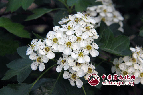 崮文化网 山楂花,是一种平凡的花,小巧玲珑、晶莹剔透。碧绿的叶子,托着一簇簇白色的小花,非常洁净漂亮。这些白色的小花每一簇由六七个小花蕊组成,淡白色的蕊衬以白花非常雅致。