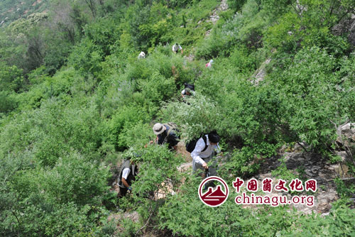 采风团一行在当地老乡的热情指引下,择由吾崮东南方向的崮坡开始攀登。往返6个多小时,沿线对该崮的地质地貌特征、植被类型、动物种类、崮顶石臼等自然人文遗存进行了细致考察。(丁军国 摄)