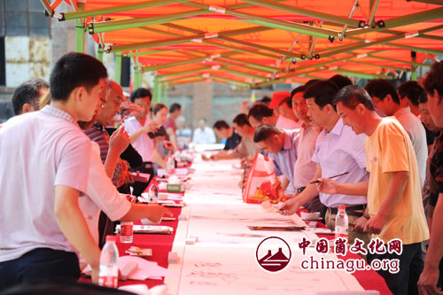 书画家挥毫泼墨创作70米长卷庆祝蒙山酿酒有限公司建厂七十周年。
