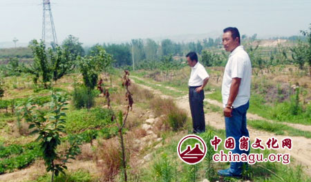 蒙阴“蜜桃哥”娄承旺在田间指导新泰果农种植蜜桃。