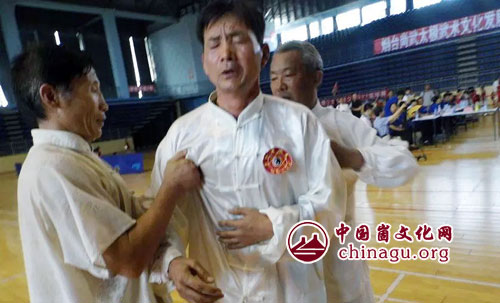 该俱乐部10名运动员参加了4个年龄段的16项拳术、器械术的比赛,获得14枚金牌,一枚银牌,一枚铜牌,并获团体总成绩一等奖。给大家带来震撼的是让人惊心动魄的点穴技术展示。队员们的直劲、捞劲、里兜劲、外背劲四个大劲的发力展示,其速度之快、威力之大已经让人不寒而栗。在毫无保护措施的情况下,强力重击对方身体致命部位,被击中者应声倒地瘫痪不能动,惨状更是让人惊惧、目不忍睹。裁判长一度快步冲上赛场中止展示,当听了简单介绍和看到倒地者经解穴救治身体霎时恢复如初时,才准予继续展示。崮乡两仪武者的精彩展示,让大家见识了中华武术的博大精深和无与伦比。