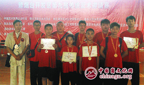 崮文化网讯 8月2日,由中国武术世界运动协会、烟台芝罘区体育总会、鲁东体育大学、烟台海河武术运动发展中心联合举办的2015年“盛大华天杯”中国烟台第二届国际武术邀请赛,在烟台国家羽毛球训练基地隆重举行,崮乡蒙阴县两仪拳武术俱乐部派出10名选手参赛,个个武艺精湛,精神饱满,敢于比拼,争金夺银。尤其是展示和演绎了濒临失传的武林瑰宝“一拳毙命,一掌复活”的两仪点穴绝技,给广大武术选手和观众带来强烈震撼和无比惊喜。