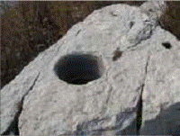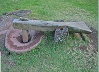 石臼就像一个硕大的蒜臼子,捣米的杵子不是一头粗一头细的木棒,是石头做成的,呈半球形,上面镶着一根握手粗的木棒,像一个硕大的蘑菇。用石臼捣米是很费力的,一般少量的米才用它捣。用石磨、石碾来不及,下顿饭又等米下锅,或者想熬一顿高粱米粥喝,石臼的应急作用就凸现出来了。再如瞭阳崮上的石臼,则与上述石臼不同。该石臼前面是石臼窝窠,其后有两个小石槽。这两个小石槽为支点,上面安装一个支架。这样的石臼就不是用直立的木棒捣碎谷子、麦子等物。而是利用杠杆原理作业了。(结构如图4所示)这样的构造,很像孩子玩的跷跷板。一般都是木石结构,支架座上,横着的是木板,固定木板,让木板只做上下运动。木板前段中间有个圆洞,用来锲入竖立的石头圆柱体(这个物件类似捣蒜的锤头)。有手下按后端或坐在后端,则捣头上升。松开木板,则捣头击打石臼窝窠,以此反反复复,一上一下的捣碎谷子、麦子。木板和支架是一体的,就像是压水井的井头,干完活扛走。