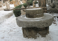 “有钱能使鬼推磨”出自南朝的刘义庆《幽明录•新鬼》,他杜撰了一段故事:有一个新到地狱的鬼,瘦弱不堪;在地狱中他遇到一个胖鬼,很是羡慕,于是就问他怎么才能变得富态起来。那个鬼告诉他,只要到人间作祟,闹出点动静,人们一害怕,就会供奉东西给他吃。瘦鬼于是高高兴兴来到人间,但他没有调查摸底,就冒冒失失闯入一户人家。见到厨房中有一口磨,抢步上前就推了起来。不巧,这家人很穷,自己都缺吃少穿,有哪有食物供奉他呢?主人听到响动,到厨房查看,空无一人,而磨在转,便感叹道:“天都可怜我,派鬼来帮我推磨了。”结果,瘦鬼推了半天,不仅没捞到半点吃的,还累得半死。 现在我们见到的石碾,在崮乡几乎随处可见。石碾是用白石做的,是用来碾米、碾面的工具。石碾由一圆形平面的碾盘和一圆柱滚形的碾磙构成,碾盘中间有一个洞,里面插着一根木柱,是整个石碾的中心轴。碾磙用木框匡着,一头固定在中心轴上,碾磙前面的木框上插一根长长的木棍,用来推碾。推碾的时候至少需要两人,一个人或多人专门推碾(也可用牲畜),一个人需要在碾磙后面,一手推着碾棍,另一手拿着笤帚,扫那些轧蹦到碾盘边上的粮食,一圈又一圈地推,碾磙一圈一圈地轧,碎了的粮食又一遍一遍地被过箩,直到不剩下渣子为止。