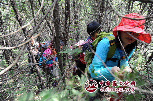 采风团成员从该崮西北方向的山地路段泊车,沿着陡峭的丘陵和崮坡,穿越茂密的丛林,登上崮顶。对母子崮的地质地貌特征、植被状况、人文遗存、旅游资源等进行了细致采访考察。(丁军国 摄影报道)