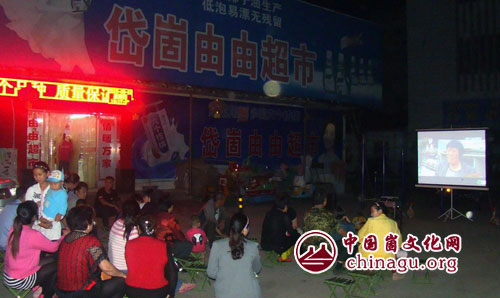 岱崮由由超市广场上,“法制小电影”吸引了崮乡群众的目光。