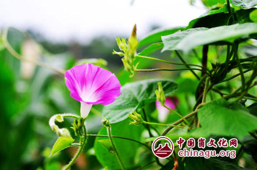 在温和的阳光沐浴下,牵牛花在晨露中尽情拓展自己的身躯。那深中带浅的指纹形叶蔓,饱饱地吮吸阳光的温暖。牵牛花开花时间有早有迟,形态各异。有的花朵正在绽开,如一张正在打开的折叠薄布,给人一种嫩嫩的美感;有的已完全展开了身姿,向大地倾吐自己的情怀。稠密的绿叶衬托着各种颜色的“小喇叭”,远远望去,好像挂着一匹漂亮的花布。走近后,一股清香迎面扑来,真可谓清香四溢。