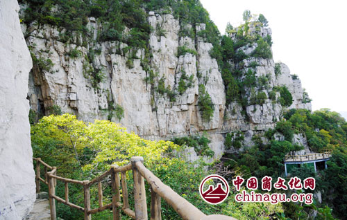 二〇一五九一三,崮会组成十六员, 目标淄川太和镇,闻名遐迩是齐山。 鲁中山区路蜿蜒,两边高山锥刺天, 环绕天际似长城,映入湖中影倒悬。 古代春秋战国乱,齐国存在八百年, 五霸七雄都临淄,文化底蕴厚积淀。 满目青山翠绿遍,山水相映似黛染, 悬索板桥河上架,人行上面脚下颤。 古时民居石墙院,手工作坊全羊馆, 山头如同人形状,倒影池中映佛泉。 石阶旁边水流潺,人间之水来自天, 七百米高观音瀑,是为天水溪之源。 曲径通幽凭栏杆,放生水池像镜面, 十余米深出奇石,甲骨刻文现齐山。 峭壁平底半洞圆,观音石像坐中间, 绿树拥簇观音阁,观音瀑布流不断。 层层平行至山巅,七级浮屠纯天然, 鬼斧神工何时造?耳闻岂比亲眼见。 古齐名人亭里念,流传成语近百篇, 登上顶峰瞰四周,青峰连绵映天蓝。 点将遗址场平展,靠北高台站将官, 巍峨挺拔将军峰,驼峰当中呈凹陷。 漫长栈道顺山转,上面陡崖下深渊, 植被茂密氧吧处,无数奇景出石岩。 回头望月石缝穿,酷似月牙挂天边, 天成栈道低矮处,如不低头通过难。 瘦身石柱转一圈,踏上木栏下直线, 悬崖峭壁齐门洞,双排并列貌一般。 洞底宽阔顶部尖,十六米高四米宽, 江北第一自然洞,透过洞口套山峦, 拍照洞形似火焰,洞底石龙脚下盘, 进的此洞出彼洞,峰回路转博惊叹。 洞顶风化出奇观,状似凤凰舞翩翩, 龙凤呈祥君王路,典故已传数千年。 霸业成就岂无缘?捷足先登戴王冠, 小白施计穿此洞?留得齐门古今谈。 中国崮网文化站,考察山水为宣传, 潜心研究崮文化,踏遍祖国名山川!