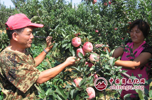 杨士永夫妇有自家种植15年的苹果园十余亩,栽植品种以“新红星”、“红富士”为主,每年到苹果成熟后一次性采摘完毕售出,大多年份均在每斤2元左右,效益一般。今年秋季在该县科协农业协会技术人员指导下,利用电脑制作了8000多个塑膜打字膜片,待苹果摘袋后及时密贴在苹果的阳面上,有字及图的部位因有深色,阳光无法直接照射到所贴的苹果表面上,苹果完全成熟采摘时,揭去膜片,此时的苹果立即显出所设计的金色字图,其他部位均呈红色,煞是好看。因其有“德行天下”、“吉祥如意”、“幸福吉祥”、“家庭幸福”、“寿”、“福”字图等,深受广大消费者青睐。据销售商介绍,这些晒字苹果,个别都卖到10多元一个。(薛军 李贵海 王铭聚)