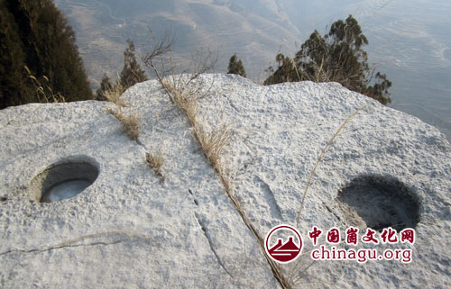 石臼有野外臼、村落臼和家臼之分。在崮顶之上的臼,笔者称之为野外臼。沂蒙山区各地的山崮上,总会见到一个两个,或三个四个甚至五六个石臼。这种臼全是利用当地资源,就地取材。在平整而又较大的青石上或花岗岩石上利用铁质利器凿坑而形成。坑呈圆形,底端锅底状,有深有浅,大小不一。将谷子放进去,然后将一根粗大的石杵(或木杵)插入石坑,双手拎着杵把上下捣击。捣击一阵子后,须将坑里的谷物掏出来,将谷皮除去,再放进石坑里捣。如此这般反复三四次后,石坑里就剩下黄澄澄的小米了。现在沂蒙地区山崮顶上的臼深达三五十厘米,直径二三十厘米不等。村落臼和家臼之应是一个类型,它处在崮下人口比较集中的地方或是个别家庭。料石稍好,个大,坑深,有的高达70多厘米,上口外径50多厘米,口径40多厘米,深约50厘米,重约四、五百公斤不等,制作也比较讲究,且多是来料加工。其特点是稳固性能好,加工能力强。这类石臼外形有方形和圆形两种,有的还雕刻上花纹和图案。但中间的坑都是圆的,外形为圆的居多。其尺寸也大小不一,但整体上都比崮上的石臼大得多。用大石臼捣米既是力气活又是技术活,首先要拎起那根笨重的石杵或木杵,捣米时力气还要用匀,否则,不是捣不出米就是把米捣烂。这种活一般是强壮的男子才能干,女人则在臼边去谷皮。后来,人们研制了一个木架,将石杵或木杵固定在木制杠杆的一端,中间放一个支点,另一端用脚踩踏,上下捣杵谷物粮食。古时候祖先们住在崮上的洞穴里、石屋里,利用这种原始器具而生活和延续,以此创造出了古代文明。到了闹匪时代,先人们住在崮顶的山寨里靠它来保证生活、求安宁。到了抗日战争和解放战争时期,我们的先辈们仍旧利用它蹍粮、蓄水,石臼成了正义的后勤保障和战胜邪恶的必备器具。