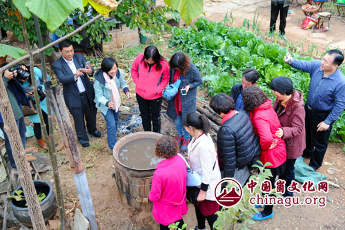 参观崮乡老人徐志本酿制柿子酒。