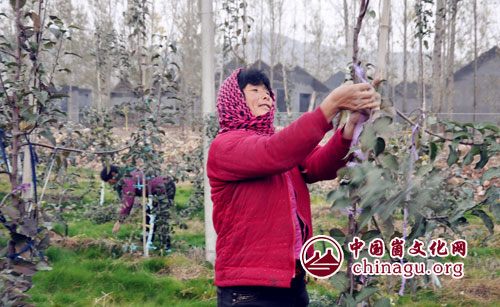 崮文化网讯 连日来,在沂水县泉庄镇天地合现代农业园区内一派繁忙的景象,园区农业工人正忙着进行苹果树压枝、树干涂白、果园施肥。