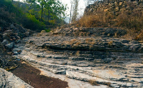 据介绍 岱崮地貌的地质有灰色薄层沙屑、砾屑灰岩,此层距今约有5-5.7亿年,形成于较为动荡的潮间带滨海环境。上覆馒头组石店段,寒武纪下统地层,它的独特成就了岱崮独特的美。随着风吹日晒,自然而然的就形成了那独特的一面,山水相交像是流水对山石的冲击形成了层层交错的水石岸。它们的凹凸不平像是被人们凿成的,但实际上完全是大自然对人类的馈赠,岩石错落有致的堆积成了水岸、石壁和山壁。岱崮地貌的别有洞天像是对水的挽留,又像是对水的放纵。
