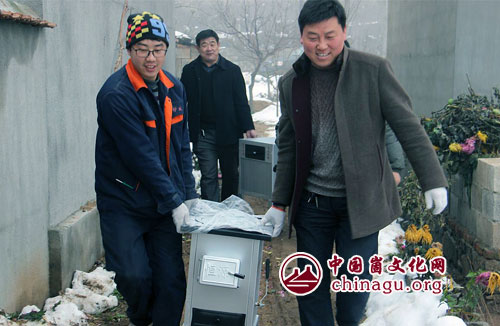王德国带领职工为蒙阴县抗战老兵免费赠送生物质炊事采暖炉。