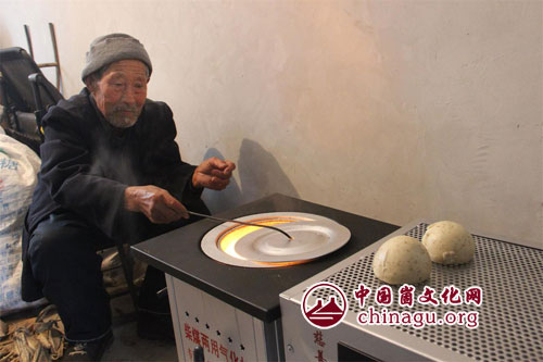 抗战老兵寒冬用上生物质炊事采暖炉。