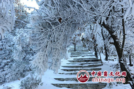 石阶路的那一头,是居高临下的山峰,有着如梦似幻般向往,雪花装饰了石阶路无尽的灵魂,让他重获新生,向往着美好的明天前进,也是这条悠长的石阶路不图回报,带给人们的无限的快乐与神往。