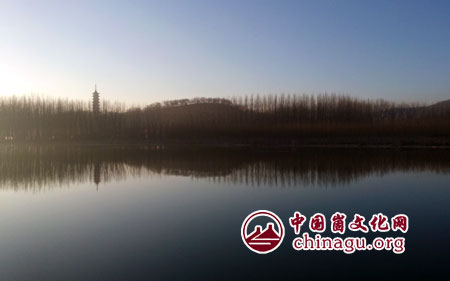 晨光初开寒气凝,两岸霜重石径行。柳杨本固倒影瘦,芦苇秆空立姿轻。高塔无欲刚正显,长河淡泊虚怀生。鹭鸟等闲自游弋,任人来去终不惊。