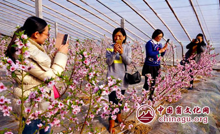 崮文化网讯 近日,随着气温回升,蒙阴街道东蒙集团的新兴农场里,温室大棚里的桃花已经竞相开放,艳丽的桃花在枝头争奇斗艳,引得游客纷至沓来。