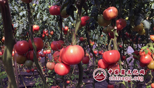 金水河沿岸的大庙有机西红柿大棚内的丰收景象。