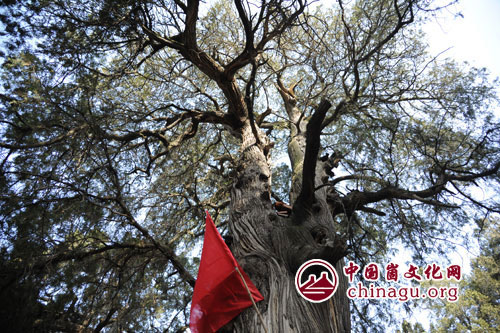 我们沿一条宽阔的土路上山。路两边,是黑森森的柏树。有的树干粗糙如鳞,粗大高挺,枝桠刺向苍穹,看年轮,应该在几百年以上。一棵落光了叶的柿子树,也有上百年了,枝桠弯曲有型,树干中间粗,下边细,树梢还有柿蒂残留。这不仅是一棵实用果树,更是一棵景观树,古朴奇特。我们走在古树森立的山路上,仿佛从远古走到现代。