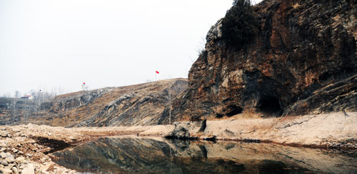 再往下走见河对面一段悬崖高耸而立,于书记指着贴近河面的地方,“看到那几个洞了吗?”