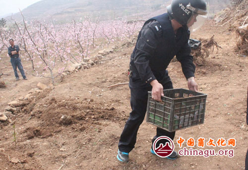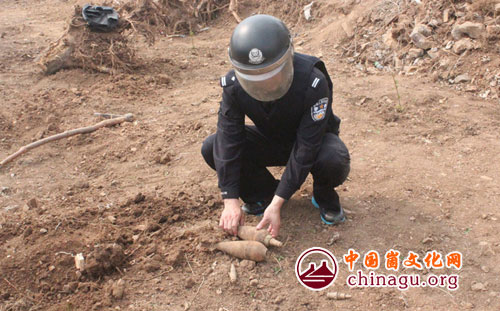 接报后,民警立即到达现场并疏散围观群众。经了解,村民伊某在桃园内的地堰垒墙掘土时意外发现两枚炮弹,其中一枚已经被他铲断,非常危险。经民警确认,这是战争时期遗留下来的迫击炮弹。弹体完整,长约40CM,直径在15CM,虽然弹体及尾翼处有锈迹,但是炸弹顶部的撞针及引信处保存完好无损,上面军绿漆清晰可见。