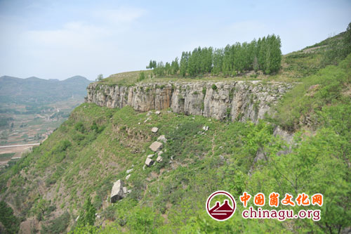 如果你从蒙阴城方向来到崮乡,快到岱崮镇驻地时,公路右侧便是一道东北西南方向的山脉。山腰间一道石壁陡峭壁立、蜿蜒起伏,石壁之上又有山,山顶又有崮。岩石分层明显,便是崮的标志性特征之一。