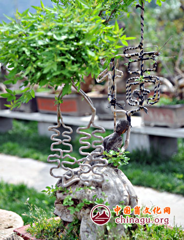 陈成军向我们演示了这些祝福盆景的制作过程。他先用钢筋制作成字模,然后将流苏树苗柔软的枝干固定在字模上,树苗便逐渐长成那个字模的形状,而后不管树长多么大,字的样子都不会改变了。他利用的就是流苏树柔软而富有可塑性的特性。