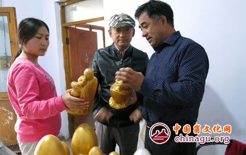 外地客商在玲鑫源工艺品厂选购“金蛋”系列工艺品。
