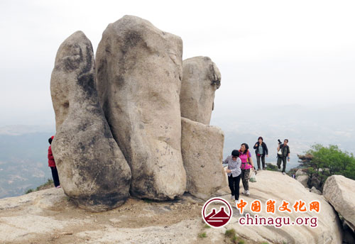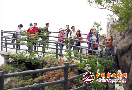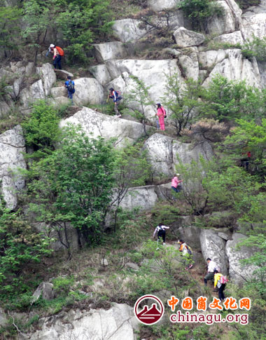 崮文化网采风团成员从蒙阴县垛庄镇椿树沟一侧,择登顶路线,沿望海楼北部山谷,穿越深山老林,沿途参观了香炉石、望海楼、玉皇顶、天桥等景点,往返行程近20公里,对望海楼风景区的自然生态和景观建设进行了参观考察。(丁军国 摄)