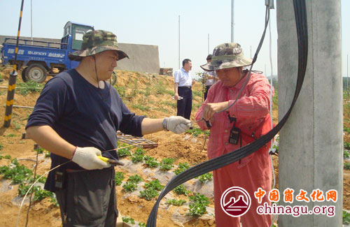 农科院专家在蒙阴现场安装数字果园电子设备。