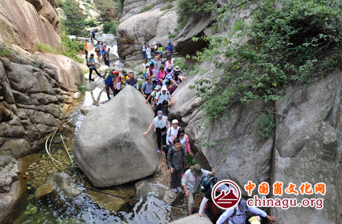 峡谷探险,溪涧寻幽。采风团成员从龙凤峪村沿着山脊谷盘旋而上,走进曲流涧,尽情享受夏日清凉。对曲流涧的山水生态、植被状况等旅游资源进行了细致考察。(丁军国 摄)