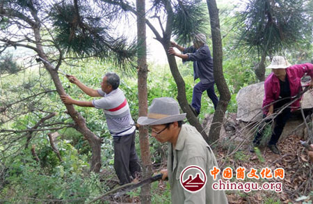 崮文化网讯 近日,在蒙阴县桃墟镇吉宝峪林场,护林工人们正在加紧开展幼林抚育工作。