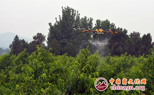崮文化网讯 近日,在蒙阴县桃墟镇民乐农机专业合作社流转经营的百亩果园里,一架植保无人直升机正在空中喷洒农药。