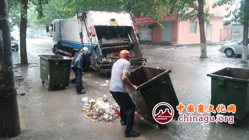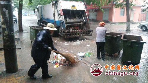 7月15日凌晨,蒙阴县城雨中忙碌的环卫工人 崮文化网记者 丁军国摄