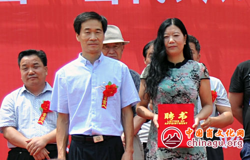 中国崮文化网总编辑丁军国向画家岩川颁发崮文化网顾问证书。