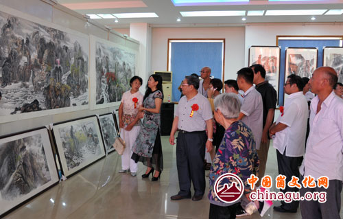 出席开幕式的领导和嘉宾参观“锦绣河山”岩川山水画展。