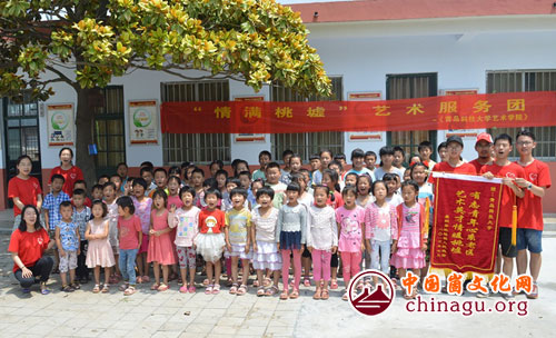 青岛科技大学艺术学院支教团与陡山小学孩子们在一起。
