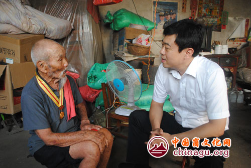 蒙阴县政府副县长任大鹏走访慰问抗战时期的伤残军人。
