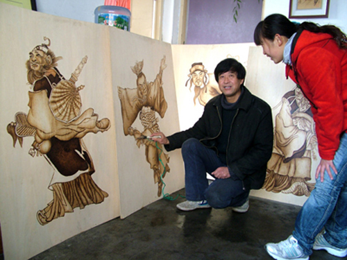 近日,山东省蒙阴县崮文化研究会的孙胜运在家中向人们展示他正在创作的几幅木板烙画水浒108将。栩栩如生、古朴典雅的水浒人物英姿飒爽,十八般兵器穿插其中,吸引了人们的眼球。 据介绍,“烙画”又称“火针刺绣”,源于西汉,盛于东汉,目前已成为一项“绝活”。像“水浒108将”如此大幅的“火针刺绣”,在市面上较为罕见。孙胜运表示,他将利用3个月的时间把108将全部烙画出来,然后举办一个展览,让人们从中感受烙画艺术的魅力。(文图:丁军国)