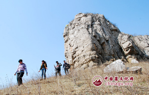 这是开春以来第一个暖和天,我们一边扒下多余的衣服,一边气喘吁吁地继续攀登,来到了南面崮跟下。这地方,是少有的断层平台,岩石表面平整,一边是高耸的峭壁,一边是渐缓的山坡。