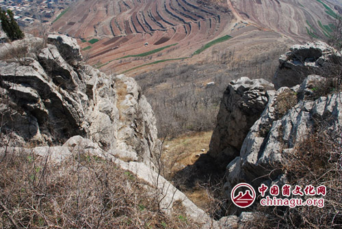 我们一面欣赏山下层层梯田,一面拍照。稍事休整后,我们围着崮壁向北绕行,寻找攀登崮顶的地方。在柱子崮东面稍微凹陷的崮壁上,荆棘丛中的石壁缝,隐约显出有人攀登过得痕迹,这就是柱子崮唯一的上山通道。